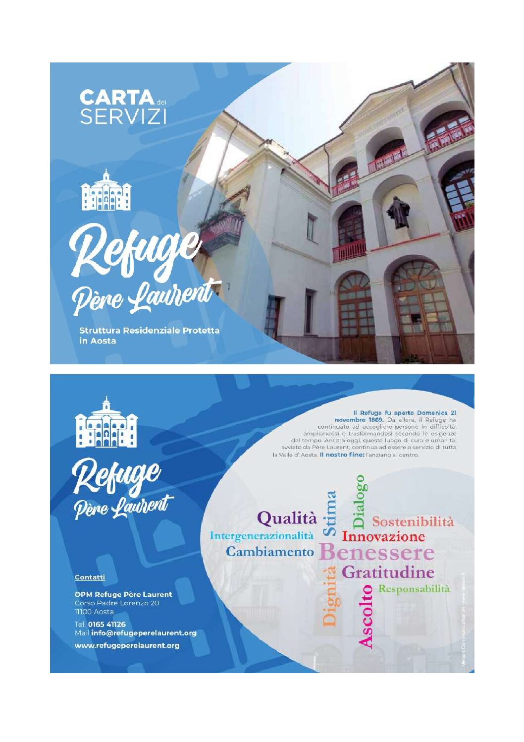 Il centro assistenziale per anziani Refuge Pere Laurent, è una struttura nata tanti anni fa nel centro di Aosta, conosciuta e ricercata proprio grazie alla professionalità e gentilezza del personale. Dotata anche di ampio giardino esterno, rende il soggiorno dei propri ospiti il più sereno possibile, cercando di farli sentire a casa loro. Refuge Père Laurent assiste ospiti anziani sia autosufficienti che non autosufficienti ed offriamo molteplici servizi Socio-Assistenziali e di Supporto.